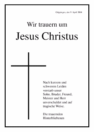 Nehmen wir's doch mal so, wie es ist: An Karfreitag denken wir an einen Menschen, der auf schreckliche Weise umgebracht wurde. Schlimm genug. Aber für alle, denen dieser Mensch etwas bedeutet hat - als Freund, als Bruder, als Vorbild - ist es ein Grund zur Trauer.